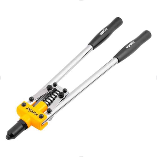 Possui cabo em aço carbono cromado revestido com borracha, proporcionando maior conforto no manuseio. Uso industrial/reforçado. Indicado para unir peças, como: chapas, tubos, perfis, entre outras, através de rebites de repuxo.