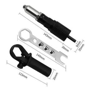 Rebitador Rebitadeira Adaptador Para Parafusadeira Rebite Especificações: Material: Aço Cor: preto + prata Interface de rebites adequados: 2,4 mm, 3,2 mm, 4,0 mm, 4,8 mm Comprimento do mandril: 30 mm / 1,2 pol. Diâmetro do mandril: 8 mm / 0,3 pol. Comprimento total do adaptador: 143 mm / 5,6 pol. sem mandril Comprimento total da chave: 149 mm / 5,9 pol. Comprimento total da alça: 123 mm / 4,8 pol.