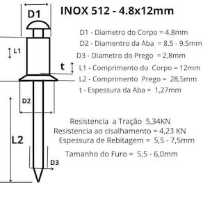 Instalação: Deve ser feito um pre-furo de 4mm nas peças a serem unidas, introduzir o rebite no furo e promover sua deformação atraves do repuxamento promovido por um rebitador manual ou pneumatico.