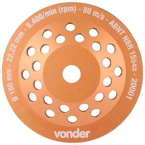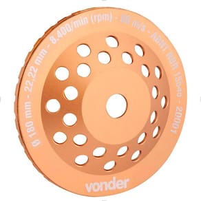Ref.: 1266180000. Marca: Vonder. Modelo: Diamantado. Diâmetro: 180 mm. Medida do encaixe do rebolo: 22,22 mm. Perfil do rebolo diamantado: Turbo. Altura da camada de diamante: 20,0 mm. Espessura da camada de diamante: 5,0 mm. Espessura do corpo do rebolo diamantado: 3,5 mm. Rotação (rpm): 8.400/min. Massa aproximada (peso): 1,04 kg.