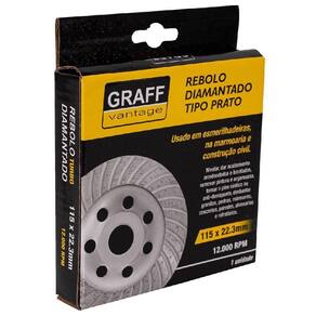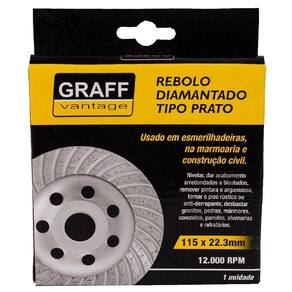 Rebolo diamantado tipo prato é indicado para uso em esmerilhadeiras, utilizado em marmoraria, construção civil/alvenaria, para nivelar, acabamentos arredondados e bisotados, remover pinturas e argamassas, tornar pisos rústicos ou antiderrapantes, desbastar granitos, pedras, mármores, concretos, paredes, alvenarias e refratários. Fabricado em material de alta resistência, oferecendo maior durabilidade ao produto.