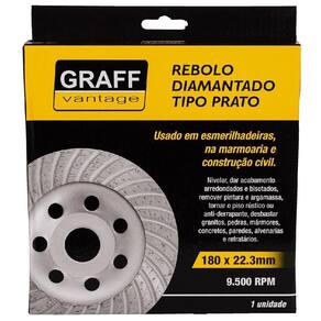 Rebolo diamantado tipo prato é indicado para uso em esmerilhadeiras, utilizado em marmoraria, construção civil/alvenaria, para nivelar, acabamentos arredondados e bisotados, remover pinturas e argamassas, tornar pisos rústicos ou antiderrapantes, desbastar granitos, pedras, mármores, concretos, paredes, alvenarias e refratários. Fabricado em material de alta resistência, oferecendo maior durabilidade ao produto.
