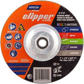 - Nome da marca: Norton Submarca: Clipper Diâmetro: 7 pol. Espessura: 1/4 de polegada de espessura Tamanho do mandril: 5/8-11 pol. Estilo: Clássico Tipo de produto: Rebolo Número na embalagem: 1 pacote Material: óxido de alumínio/carboneto de silício Compatibilidade: rebarbadora de ângulo reto Velocidade máxima: 8600 rpm Tipo de mandril: Tipo 27 Aplicações: Moagem portátil