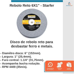 CARACTERÍSTICAS TÉCNICAS: Material: Óxido de alumínio Medidas: 152mm - 6 diâmetro x 25,4mm - 1 largura x 1.1/4 diâmetro furo Rotação máxima: 4400 rpm - 35m/s Tipo: Ferros e metais leves Grão: 60 Marca: Starfer Ref.: 1102613 Ean: 7891638060176