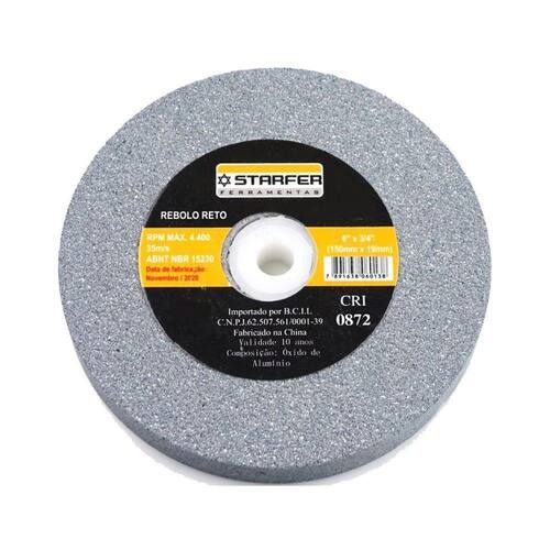 CARACTERÍSTICAS TÉCNICAS: Material: Óxido de alumínio Medidas: 152mm - 6 diâmetro x 19mm - 3/4 largura x 1.1/4 diâmetro furo Rotação máxima: 4400 rpm - 35m/s Tipo: Ferros e metais pesados Grão: 36 Marca: Starfer Ref.: 1102516 Ean: 7891638060114