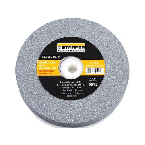 CARACTERÍSTICAS TÉCNICAS: Material: Óxido de alumínio Medidas: 152mm - 6 diâmetro x 19mm - 3/4 largura x 1.1/4 diâmetro furo Rotação máxima: 4400 rpm - 35m/s Tipo: Ferros e metais pesados Grão: 60 Marca: Starfer Ref.: 1102532 Ean: 7891638060138