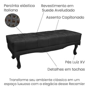 Estofado em suede veludo light 180g: toque macio e eleganteAssento capitonado para visual sofisticadoPés Luiz XV em madeira maciça, resistentes e decorativosTachinhas em metal fumê para acabamento de alto padrãoIdeal para apoio, composição decorativa ou uso aos pés da camaDisponível em 6 cores para combinar com seu estilo