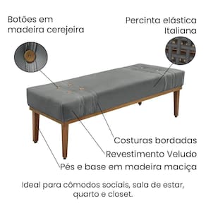 Seu estofado é revestido com veludo deluxe 250g, oferecendo textura macia e visual sofisticado. A estrutura é feita em madeira maciça, garantindo durabilidade, enquanto os botões decorativos em madeira cerejeira adicionam charme artesanal à peça.