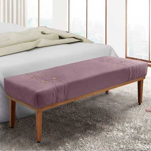 Seu estofado é revestido com veludo deluxe 250g, oferecendo textura macia e visual sofisticado. A estrutura é feita em madeira maciça, garantindo durabilidade, enquanto os botões decorativos em madeira cerejeira adicionam charme artesanal à peça.