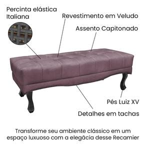 Revestimento em veludo Deluxe 250g: elegante e confortávelAssento capitonado: sofisticação e aconchegoPés em madeira maciça estilo Luiz XVDetalhes em tachas fumê para acabamento refinadoDiversas cores para personalizar seu ambienteFácil montagem: basta fixar os pés