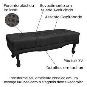 Os pés Luiz XV em madeira maciça elevam a elegância, enquanto as tachinhas em metal fumê adicionam um toque luxuoso e artesanal. Ideal para compor quartos, closets, halls de entrada ou até salas amplas, o Recamier Vicenza é a peça perfeita para transformar qualquer espaço em um ambiente requintado e acolhedor.