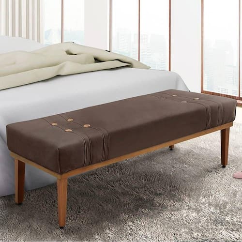 Seu estofado é revestido com veludo deluxe 250g, oferecendo textura macia e visual sofisticado. A estrutura é feita em madeira maciça, garantindo durabilidade, enquanto os botões decorativos em madeira cerejeira adicionam charme artesanal à peça.