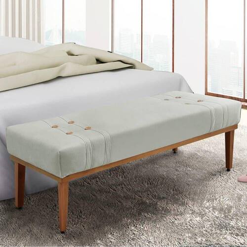 Seu estofado é revestido com veludo deluxe 250g, oferecendo textura macia e visual sofisticado. A estrutura é feita em madeira maciça, garantindo durabilidade, enquanto os botões decorativos em madeira cerejeira adicionam charme artesanal à peça.