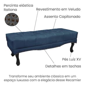 Revestimento em veludo Deluxe 250g: elegante e confortávelAssento capitonado: sofisticação e aconchegoPés em madeira maciça estilo Luiz XVDetalhes em tachas fumê para acabamento refinadoDiversas cores para personalizar seu ambienteFácil montagem: basta fixar os pés