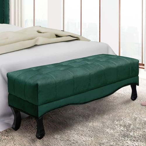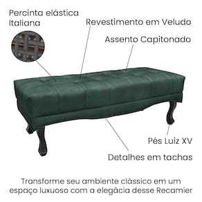 Revestimento em veludo Deluxe 250g: elegante e confortávelAssento capitonado: sofisticação e aconchegoPés em madeira maciça estilo Luiz XVDetalhes em tachas fumê para acabamento refinadoDiversas cores para personalizar seu ambienteFácil montagem: basta fixar os pés