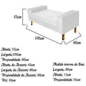 Com uma estrutura e beleza única, o Recamier Félix se adapta em qualquer ambiente, tornando-o ainda mais elegante e harmonioso. Um Recamier luxuoso de alta qualidade, dará um toque especial em seu ambiente. Não perca essa oportunidade de levar mais charme e requinte ao seu cômodo, adquira já o seu! Especificações Técnicas do Recamier Félix: - Altura: 53 cm; - Largura: 100 cm; - Profundidade: 60 cm; - Altura do Assento: 42 cm; - Largura do Assento: 80 cm; - Profundidade do Assento: 60 cm; - Altura dos Pés: 18 cm; - Peso: 35 kg. - Peso Suportado: 220 kg. Medida Interna do Baú: - Altura: 11 cm; - Largura: 80 cm; - Profundidade: 55 cm; Diferenciais do Recamier Félix: - Material da Estrutura: fabricado com Madeira Pinus e Eucalipto Reflorestada, e alguns detalhes em MDF; - Tipo de Assento: estofado e com espuma de densidade D-26; - Tipo de Encosto: estofado e com espuma de densidade D-18; - Detalhes do Tecido: possui detalhes em botonê, onde os botões são revestidos no mesmo tecido do produto e finalizados com excelente acabamento; - Detalhes dos Pés: acompanha kit de pés (4 pés) de madeira, no estilo Luís XV, com alta resistência; - Volumes: nessa compra você receberá um único produto. Recomendações de limpeza: -Limpar com flanela limpa e seca. Não molhar o móvel e não expor em lugar úmido ou próximo de fontes de calor. Não usar produtos abrasivos. Observações Importantes: - As imagens ambientadas são meramente ilustrativas e podem apresentar itens que não compõe o produto; - Objetos decorativos que aparecem na foto não acompanham o produto; - As cores do produto podem variar de acordo com o monitor, a iluminação do ambiente, ou sua percepção visual; - O Recamier Félix chegará montado para você, bastando rosquear os pés; - Confira as dimensões antes da compra e certifique-se de que o produto passará por elevadores, portas e corredores, já que nossa entrega não inclui a subida de lances de escada, ou o lançamento de produtos; - Ao receber seus produtos, verifique no ato do recebimento qualquer dano na embalagem. Caso tenha alguma avaria, favor não assinar o comprovante de recebimento (A transportadora tem obrigação de esperar a conferência); - Produto para uso residencial em ambiente interno, não devendo ficar exposto diretamente ao sol, calor e umidades excessivas.