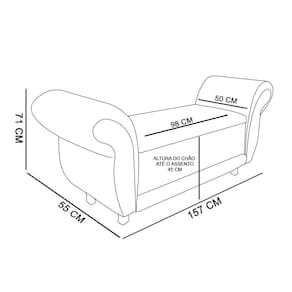 Produzida em estrutura em madeira de eucalipto, tapeçada com espuma de poliuretano, tecido suede com baú, foi feito para guardar o que você quiser, com a vantagem de que ele pode ser usado como sofá e namoradeira aos pés da cama e ainda tem mais: por ser todo estofado, o Recamier Itália tem o plus de ser um confortável recamier. aproveite e deixe o seu quarto/sala mais elegante e sofisticado com esse Recamier. Dimensões Altura: 71 cm Largura: 157 cm Profundidade: 55 cm Altura assento: 45 cm Peso: 22 KG Especificações do Produto Estrutura: Madeira Eucalipto Espuma: D-23 Tecido: Suede (100% Poliéster) Tipo de pés: Pés em madeira Peso Suportado: Até 220 Kg Garantia: 90 dias contra defeito de fabricação Montagem: O produto vai montado, apenas rosquear os pés Instruções de Limpeza: Utilizar um pano limpo e levemente úmido Observações Relevantes - Todos os produtos vão embalados com total segurança; - As cores dos produtos podem sofrer alterações dependendo do seu monitor; - Para futuras compras, não garantimos a mesma tonalidade de cor, pois existe variação a cada lote do fabricante do tecido; - As imagens são meramente ilustrativas, não acompanham objetos de decoração e eletros; - Confira as dimensões do produto no momento da compra e certifique-se de que passará normalmente por escadas, elevadores, portas e corredores; - Importante: Por se tratar de estofado as medidas podem ter uma pequena variação em até 3 cm; - Não nos responsabilizamos no ato da entrega por montagens, desmontagens, instalações de produtos; - Não nos responsabilizamos no ato da entrega por subir escadas, elevadores, nem utilização de guinchos ou equipamentos similares para acesso a pisos superiores em apartamentos; - A entrega do produto é realizada em todo território nacional, até onde as rodovias alcançam, entregas fluviais ou aéreas devem ser cotadas a parte; - Observando as orientações acima, evita-se futuros desagrados ou imprevistos com a entrega do produto. Havendo despesas adicionais, serão de responsabilidade do cliente;