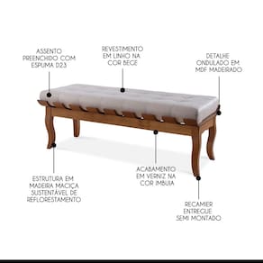 Com um visual leve e atemporal, o Recamier Isabela em linho bege é a peça coringa que faltava na sua casa. A estrutura em madeira maciça sustentável e o acabamento em verniz tom Imbuia garantem durabilidade e um toque de rusticidade elegante. O assento com espuma D23 é revestido em linho, trazendo conforto com um visual clean e sofisticado. Perfeito para compor a decoração do quarto aos pés da cama, ele também pode ser utilizado como banco na entrada da casa, assento extra para visitas ou até como apoio charmoso em closets e corredores. Seu design ondulado confere um charme artesanal que combina com diversos estilos de interiores. CARACTERÍSTICAS TÉCNICAS: - Estrutura Produzida em Madeira Maciça Sustentável de Reflorestamento - Detalhes Ondulados Produzidos em MDF Madeirado - Acabamento em Verniz na cor Imbuia - Assento Estofado Preenchido com Espuma D23 - Revestimento em Tecido Linho na cor Bege M58 - Peso Suportado de até 120kg - Recamier Entregue Semi Montado INFORMAÇÕES TÉCNICAS: - Altura: 47 cm - Largura: 140 cm - Profundidade: 55 cm - Peso: 18 kg INFORMAÇÕES ADICIONAIS: Garantia para defeitos de fabricação conforme Código de Defesa do Consumidor. - ATENÇÃO: Entregas são feitas em horário comercial. Não nos responsabilizamos pela montagem, subir ou içar o móvel. - As imagens ambientadas são meramente ilustrativas e podem apresentar itens que não compõe o produto, as cores do produto podem variar de acordo com o monitor, a iluminação do ambiente ou sua percepção visual. - Limpeza: Deve ser feita com pano macio e seco ou levemente umedecido com água e sabão neutro. Não devem ser utilizados abrasivos. Marca: Rio Madeira Interiores
