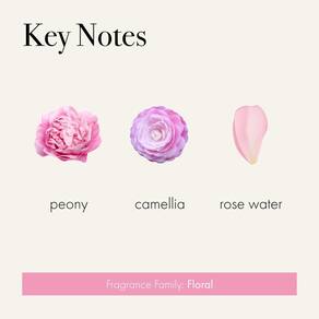 - Aroma: a peônia duquesa evoca um vaso de delicadas peônias e rosas rosa cercadas por bagas de cassis brilhantes. Pétalas de camélia macias e almíscar floral em pó inspiram um acabamento sutil.