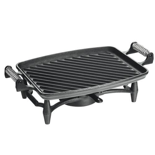 Chapa Grill com 33 cm comprimento x 25 cm largura, essa medida corresponde somente a área útil da chapa, ou seja, não inclui as alças. Chapa com estrias para preparar deliciosos grelhados e canaleta que armazenam os líquidos para deixar o centro mais aquecido. A chapa também pode ser utilizada em todos os tipos de fogão. Alças em Espiral. Fogareiro todo em ferro fundido, a álcool com regulador de chama, base em peça única que facilita o manuseio. Fogareiro atinge temperatura suficiente para esquentar a chapa e preparar a carne mesmo crua. Todo em ferro fundido esse réchaud tem durabilidade imensurável, e conserva por mais tempo o calor. Muito utilizado por bares, restaurantes e hotéis para servir porções e mantê-las aquecidas.