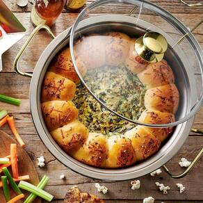 01 Rechaud 01 Cuba para Comida 01 Cuba para Água 01 Tampa de Vidro com Respiro 01 Fogareiro 01 Suporte Traseiro para Tampa