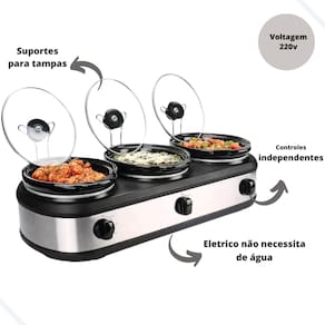 Este campeão de cozimento lento permite que você cozinhe até 3 pratos separados de uma vez, enquanto mantém o alimento quente por horas. São 3 controles separados com o Botão OFF e 3 ajustes; baixa, alta e quente. Dando-lhe a flexibilidade para cozinhar e ou aquecer o que quiser, quando quiser. Tampas de vidro temperado, panelas de cerâmica de 2,4L e colheres de servir.De fácil limpeza. Mais seguro e usa menos energia do que um fogão. Misture os ingredientes, defina a temperatura e deixe cozinhar ao seu gosto! Em pouco tempo você terá 3 pratos deliciosos. Recursos built-in tampa descansa para minimizar a desordem e garantir a segurança de servir.Mantenha quente e sirva 3 pratos. Este rechaud lento triplo aumenta sua versatilidade na preparação da refeição e é ótimo para qualquer cozinha. O design traz elegância em sua bancada e é o anfitrião perfeito para qualquer festa, almoço ou jantar com amigos.Informações do produtoCor PrataCapacidade 7,2l ( 3 panelas de 2,4L cada m cerâmica)Conteúdo da Embalagem 03 panelas com 2,4 litros; 3 colheres para servir e suporte para cada tampa.Tipo do Produto Rechaud tripo buffetIndicação de Uso Servir alimentosGarantia do vendedor: 30 diasGarantia do vendedor: 30 dias Marca: Member's Mark