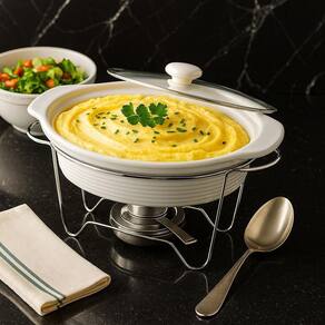 Rechaud Oval em Cerâmica com Queimador 1,5L - Elegância e Praticidade à Mesa O Rechaud Oval em cerâmica é a escolha perfeita para quem deseja manter os alimentos aquecidos durante toda a refeição, unindo funcionalidade e sofisticação na apresentação. Com capacidade de 1,5 litro, é ideal para servir massas, sopas, risotos e outros pratos que merecem ser mantidos na temperatura ideal. A travessa de cerâmica branca possui alta resistência térmica, podendo ser utilizada para gratinar ou aquecer os alimentos antes de servir. Seu suporte metálico robusto oferece estabilidade, enquanto o queimador com regulagem de chama proporciona aquecimento contínuo, sem comprometer a segurança. A tampa de vidro temperado com pegador facilita o monitoramento do alimento, mantendo o calor sem a necessidade de remoção constante. Especificações: Capacidade: 1,5 litros Dimensões: 35 cm largura x 21,5 cm profundidade x 21,5 cm altura Material da travessa: Cerâmica branca de alta resistência Material do suporte: Aço com acabamento cromado Tampa: Vidro temperado com puxador central Queimador: Reservatório para álcool com ajuste de chama Peso aproximado: 2,1 kg Diferenciais: Design sofisticado e atemporal Mantém os alimentos aquecidos com eficiência Ideal para jantares, buffets e ocasiões especiais Fácil de limpar e manusear Estrutura desmontável para melhor armazenamento Marca: Não Informado