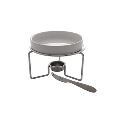 • 1 Prato em Cerâmica 1 Difusor de Calor em Alumínio 1 Suporte Niquelado 1 Vela 1 Faca em Inox