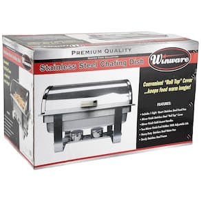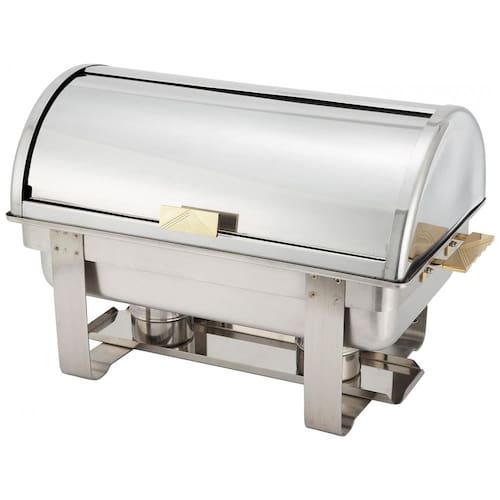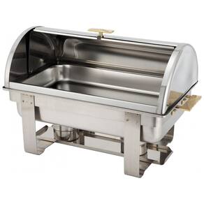 Inclui uma panela de comida de tamanho completo, panela de água sem gotejamento de 5 centímetros de profundidade, tampa de cúpula e dois suportes de combustível tampa roll top de aço inoxidável Alças e pernas com detalhes dourados
