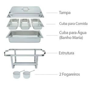 Contém quatro cubas removíveis, três para os alimentos com capacidade de 3 litros cada e outra para a água banho-maria com capacidade de 9,5 litros, que mantém os alimentos aquecidos pelo calor do s fogareiro s .