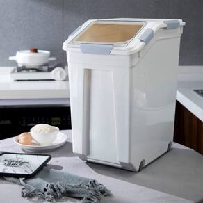 Este recipiente de armazenamento de alimentos é feito de material PP de grau alimentício, livre de BPA. É ideal para armazenar arroz, farinha, milho, feijão, alimentos secos para animais de estimação, etc. A capa hermética de silicone selada com uma tampa flip e 6 travas mantém os alimentos frescos e seguros e evita umidade e poeira. Ele é projetado em cinco tamanhos disponíveis para você escolher a melhor opção conforme necessário. O recipiente de armazenamento pode ser utilizado como um armazenador de arroz/grãos, armazenamento de despensa, recipiente de ração para animais de estimação para ração de cachorro, comida de gato ou semente de pássaros, bem como uma caixa de armazenamento para brinquedos, coleira, areia de gato, etc. - Este recipiente de armazenamento de alimentos é feito de material PP livre de BPA, vem com um copo de servir. - Capa hermética de silicone selada com uma tampa dobrável e 6 fechaduras: mantenha arroz, farinha, milho, feijão ou alimentos secos para animais de estimação frescos e saudáveis. É à prova de umidade, poeira e não vazamento. - 33 litros - 29 cm L x 44 cm x 40 cm A, comporta aproximadamente 22,7 kg de arroz ou 16 kg de ração seca para animais de estimação. - O design com pequeno sulco sob a tampa para uma pequena cesta, que é para colocar o "anis estrelado seco" ou "absorvente de umidade" (vendido separadamente) para proteger os alimentos de pragas e manter frescos. - Uma alça e quatro rodas: um design para facilitar o movimento e armazenamento.