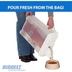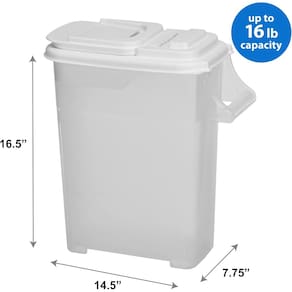 Recipiente de armazenamento de alimentos para animais de estimação Buddeez - Recipiente de armazenamento de alimentos para cães com capacidade de 16 libras, recipiente para comida para gatos, recipiente para armazenamento de sementes de pássaros com alça durável EZ e tampa giratória EZ com bico de vazamento (tampa branca)
