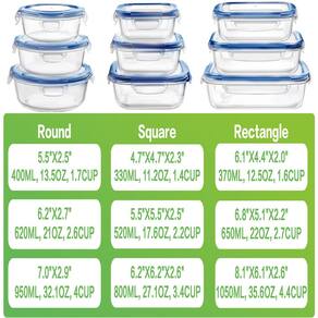 HOMBERKING Conjunto de recipientes de armazenamento de alimentos de vidro com 18 peças (9 tampas e 9 recipientes) Inclui 3 tipos diferentes e 9 volumes para suas necessidades: 9 tampas 1 recipiente de vidro retangular de 370 ml, 15,5 x 11,2 x 5 cm, 354 g/1,6 xícara 1 recipiente de vidro retangular de 650 ml, 17,3 x 13 x 5,6 cm, 623 g/2,7 xícara 1 recipiente de vidro retangular de 1050 ml, 20,6 x 15,5 x 6,6 cm, 1009 g/4,4 xícaras 1 recipiente de vidro quadrado de 330 ml, 12 x 12 x 5,8 cm, 317 g/1,4 xícara 1 recipiente de vidro quadrado de 520 ml, 14 x 14 x 6,3 cm, 499 g/2,2 xícara. 1 recipiente de vidro quadrado de 800 ml, 15,7 x 15,7 x 6,6 cm, 768 g/3,4 xícaras 1 recipiente de vidro redondo de 400 ml, 14 x 6,3 cm, 382 g/1,7 xícara 1 recipiente redondo de vidro de 620 ml, 15,7 cm x 6,9 cm, 695 g/2,6 xícara 1 recipiente de vidro redondo de 950 ml, 18 x 7,4 cm, 910 g/4 xícaras Nossos recipientes são feitos de material seguro e ecológico: O corpo principal do recipiente - vidro borossilicato transparente. A tampa do recipiente - tampas de plástico sem BPA e tira de vedação de silicone azul profundo Eles podem ser utilizados de -20 °C a 400 °C. Seguro para forno (não as tampas). Seguro para micro-ondas (não as tampas). Seguro para freezer. Pode ser lavado na lava-louças (não as tampas). Dicas: 1. Para evitar que as tiras de vedação de borracha grudem nos recipientes de vidro, certifique-se de lavar e secar as tampas e recipientes de vidro antes de guardá-los. 2. É seguro lavar as tampas na máquina de lavar louça, mas altas temperaturas por um longo período de tempo podem deformar as tiras de vedação de borracha na borda das tampas. Para prolongar a vida útil das tiras de vedação de borracha, lave as tampas à mão o máximo possível. 3. Se você tiver alguma dúvida, a qualquer momento. com você em 24 horas. - [Conjunto de 9 recipientes de vidro] O conjunto de recipientes de armazenamento de alimentos HOMBERKING inclui 3 tipos e 9 tamanhos para suas diferentes necessidades. Recipientes retangulares: 1 x 370 ml (1,6 xícaras), 1 x 650 ml (2,8 xícaras), 1 x 1050 ml (4,5 xícaras), recipientes quadrados: 1 x 330 ml (1,4 xícaras), 1 x 520 ml (2,2 xícaras), 1 x 800 ml (3,4 xícaras), recipientes redondos: 1 x 400 ml. 1,7 xícaras), 1 x 620 ml (2,7 xícaras), 1 x 950 ml (4,1 xícaras) (considere uma diferença de 0,3 a 0,8 cm devido às medidas manuais). Perfeito para academia, sobras, piquenique, controle de porções, almoços de trabalho, viagens e muito mais - Seguro para micro-ondas/forno e freezer] Nossos recipientes podem suportar temperaturas de -15 °C a 400 °C, você pode usá-los no forno/micro-ondas (não nas tampas) e no freezer. O vidro borossilicato de alta qualidade é mais durável, permitindo que você use os recipientes dentro da faixa de temperatura permitida sem se preocupar com a quebra da caixa. Não coloque as tampas no micro-ondas/forno para evitar deformação da tampa e da tira de silicone - [Design à prova de vazamento] Os recipientes de armazenamento de vidro HOMBERKING usam a tampa de bloqueio aprimorada, o fecho de pressão e a vedação de silicone ajudam a melhorar o desempenho à prova de vazamento de nossos recipientes, evitando o odor dos alimentos e mantendo a delícia autêntico dos alimentos, o que será melhor para manter fresco do que outros. Mantenha sua mesa de jantar e mochila limpas - [Livre de BPA e fácil de limpar] A tampa de bloqueio de plástico livre de BPA é segura e à prova de vazamentos. O vidro borossilicato transparente é fácil de limpar sem absorver manchas ou cheiros. Podem ser lavadas na lava-louças em vez de lavar à mão. A vedação de silicone também é removível para você limpar e secar. Para evitar que a vedação grude nos recipientes, lave as tampas e recipientes antes de guardá-los - [Atende às suas necessidades] O conjunto de recipientes de vidro HOMBERKING é empilhável (não empilhe recipientes sem separar por camada de plástico ou outra coisa para evitar fricção e quebra), economizando espaço. Eles são ideais para organização de casa e cozinha, também uma surpresa perfeita para você, seus amigos e familiares. Sempre apoiaremos nossos produtos. Se você não estiver satisfeito com seus produtos ou receber produtos danificados, com nossa loja
