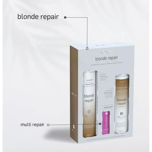 Red iron caixa kit blonde repair 2+1 A linha blonde repair foi desenvolvida para cabelos loiros, descoloridos ou com mechas. Com a tecnologia aminolux system, um sistema exclusivo da red iron, que combina proteínas, lipídios e vitaminas para restaurar e criar um escudo protetor, impedindo a ação dos radicais livres. A descoloração pode deixar os cabelos loiros ressecados, porosos, quebradiços e sem brilho. O aminolux system, com alta compatibilidade com a fibra capilar, penetra no córtex, promovendo reparação de dentro para fora e fechando as cutículas. Contém aminoácidos biofuncionais do trigo para repor moléculas de proteínas. O kit desta linha contém: 01 shampoo 300ml + 01 condicionador 250ml + 01 ampola de alto impacto 30ml