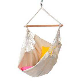 Uma rede de uso e instalação diferentes da rede tradicional. Também bastante usada como elemento decorativo, ela é sempre um convite para um gostoso balanço e momentos de leitura. Inclui haste de sustentação e madeira.