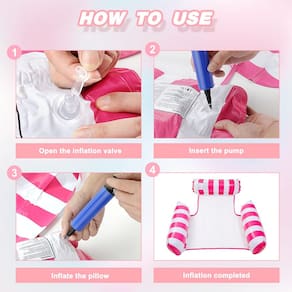1 -?Confortável e descontraído?: O design ergonômico do Pool Float oferece amplo conforto, com dois braços laterais e apoio de cabeça para fornecer suporte para costas e braços durante todo o dia. Você sempre estará semissubmerso, então é fácil se refrescar sob o sol quente do verão -?Material seguro e ecológico?: estes brinquedos de piscina são feitos de PVC de alta qualidade, que é seguro, ecológico, não tóxico e não prejudica sua pele. Robusto, grosso e coberto por uma malha macia e confortável para suporte e conforto. Pode ser usada repetidamente por muito tempo e não é fácil de deformar -?Rede aquática multifuncional 4 em 1?: recurso aquático 4 em 1 exclusivo que pode ser utilizado como rede, espreguiçadeira, andarilho e selim esportivo, o flutuador aquático perfeito, você pode mudar livremente de posição na rede aquática, se divertir na piscina e relaxar. E temos uma bomba de ar para você -?Mantenha seu corpo fresco e flutuante?: Este flutuador para piscina consiste em grandes almofadas flutuantes e um assento de malha de apoio, e seu design semissubmerso aumenta o contato do corpo com a água. As balsas infláveis ajudam você a sentir o mundo fresco, aproveitar e relaxar neste momento maravilhoso -?Portátil e durável?: Três travesseiros infláveis se conectam a uma rede de malha macia e confortável, o suficiente para suportar todo o corpo. É dobrável e compacto, fácil de inflar e fácil de transportar em uma mochila