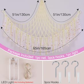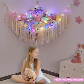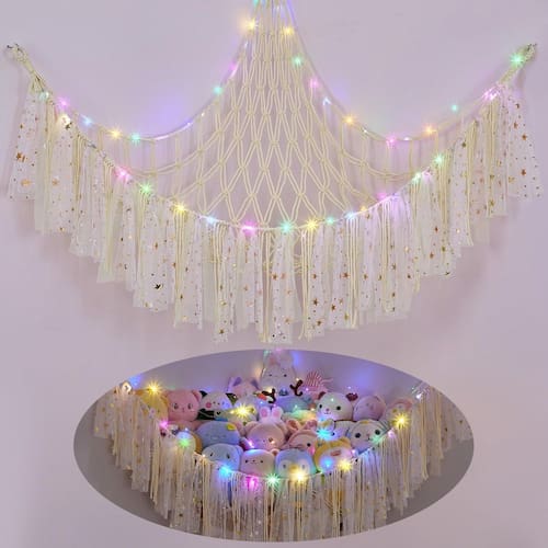 FIOBEE Rede ou rede de animais de pelúcia com luz de LED, rede de brinquedo pendurada para animais de pelúcia, organizador de armazenamento, decoração de quarto com borlas para berçário, sala de jogos, quarto de crianças - Armazenamento de animais de pelúcia pendurados: organizador de brinquedos decorado com borlas de renda coloridas e vem com cordão de luz LED que pode ser utilizado como luz noturna; o armazenamento da sala não apenas mantém os quartos das crianças mais organizados, mas também adiciona uma atmosfera acolhedora ao canto da sala - Economia de espaço: design de pendurar na parede, nossa rede de animais pode ser pendurada em um canto da parede, não ocupa espaço extra; mantém o quarto das crianças arrumado e espaçoso; ideal para berçário, pré-escola, sala de jogos, quarto infantil, grande o suficiente para guardar animais de pelúcia - Material: Nossa rede para bichos de pelúcia é feita de corda tecida à mão premium, não solta ou vaza, o que é durável; equipado com anéis de metal para pendurar; nosso tamanho de suporte de bichos de pelúcia é 100 x 100 x 149 cm - Escolha ideal: a organização do berçário deve ser uma ótima escolha para crianças, aparência bonita e função de armazenamento; e as crianças desenvolverão bons hábitos de armazenamento de brinquedos, é uma ótima maneira de manter animais de pelúcia fofos em exibição - Fácil de instalar: pacote incluído, 1 pacote de rede de animais de pelúcia, luz de cordão de LED, 3 ganchos de peça; é fácil montar o armazenamento de brinquedos infantis no canto do quarto; para evitar virar, mantenha os três ganchos no mesmo nível; não incluindo pilhas