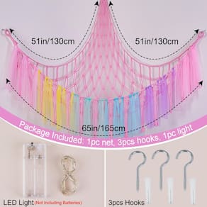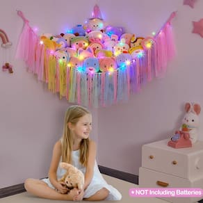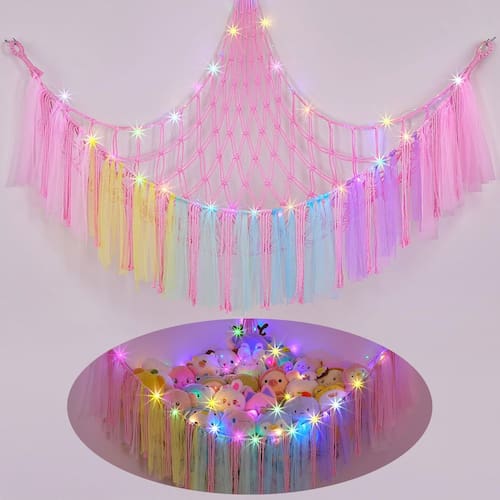 FIOBEE Rede ou rede de animais de pelúcia com luz de LED, rede de brinquedo pendurada para animais de pelúcia, organizador de armazenamento, decoração de quarto com borlas para berçário, sala de jogos, quarto de crianças - Armazenamento de animais de pelúcia pendurados: organizador de brinquedos decorado com borlas de renda coloridas e vem com cordão de luz LED que pode ser utilizado como luz noturna; o armazenamento da sala não apenas mantém os quartos das crianças mais organizados, mas também adiciona uma atmosfera acolhedora ao canto da sala - Economia de espaço: design de pendurar na parede, nossa rede de animais pode ser pendurada em um canto da parede, não ocupa espaço extra; mantém o quarto das crianças arrumado e espaçoso; ideal para berçário, pré-escola, sala de jogos, quarto infantil, grande o suficiente para guardar animais de pelúcia - Material: Nossa rede para bichos de pelúcia é feita de corda tecida à mão premium, não solta ou vaza, o que é durável; equipado com anéis de metal para pendurar; nosso tamanho de suporte de bichos de pelúcia é 100 x 100 x 149 cm - Escolha ideal: a organização do berçário deve ser uma ótima escolha para crianças, aparência bonita e função de armazenamento; e as crianças desenvolverão bons hábitos de armazenamento de brinquedos, é uma ótima maneira de manter animais de pelúcia fofos em exibição - Fácil de instalar: pacote incluído, 1 pacote de rede de animais de pelúcia, luz de cordão de LED, 3 ganchos de peça; é fácil montar o armazenamento de brinquedos infantis no canto do quarto; para evitar virar, mantenha os três ganchos no mesmo nível; não incluindo pilhas