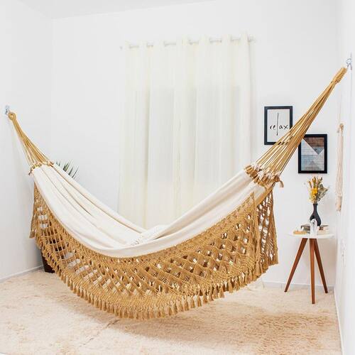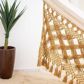 Essa rede de dormir possui nas suas laterais trabalhos artesanais em macramê feito a mão.