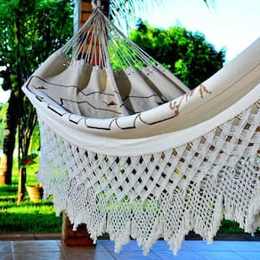 A textura dessa rede de dormir contém pequenas casinhas que permitem bordar diversos desenhos. Nas bordas antes do punho tem um entrançado manual valorizando o trabalho artesanal, e uma varanda esplêndida toda feita à mão. Use-a para decorar sua sala, quarto ou varanda da sua casa e curta o conforto que só as Rede de Descanso proporciona para você.Dimensões: 2,55 m x 1,55 m (só tecido). Comprimento Total: 4,25 m ( punho a punho). Peso: +/- 3.000 kg. Capacidade Máxima de Carga: 180 kg. Composição: 100% Algodão. Distância Ideal dos Ganchos: Aprox. 2,90 a 3,60 m. Altura Ideal dos Ganchos: Aprox. 1,90 m.Garantia: O prazo de validade é por tempo indeterminado, nossas redes para dormir não mancham e nem soltam tinta, desde que sejam lavadas de acordo com o manual que as acompanham. Pode haver uma diminuição ou esticamento do tamanho total devido à lavagem. Nossas redes de dormir são pré-selecionadas por uma equipe que atesta a sua segurança e a qualidade contra os defeitos de fabricação.