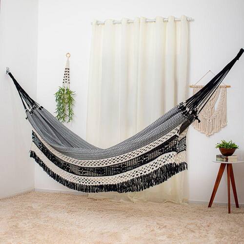 A Rede de Dormir Casal Ostra Preto com Bege é perfeita para quem busca conforto e qualidade para 2 ou mais pessoas. Com suas medidas de 4,20 x 1,65 m, ela oferece espaço suficiente para relaxar e descansar. Seu acabamento feito à mão, com barras de crochê, proporciona um toque especial e uma opção de decoração diferenciada para qualquer ambiente.