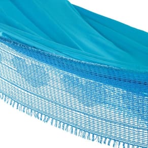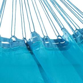 A Rede de Domir Casal Sol a Sol Azul Claro foi confeccionada em tecido de brim 100% algodão, é antialérgica e não solta tinta. O seu tecido é bastante liso e tem muita semelhança com o lençol. Sua gramatura é de 240 gramas por m2 e é altamente resistente.