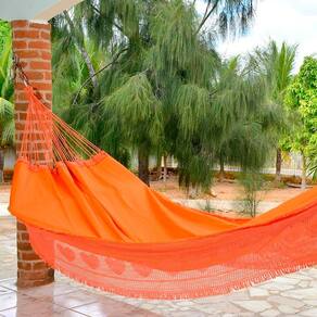 A Rede de Domir Sol a Sol Laranja, foi confeccionada em tecido de brim 100% algodão, anti-alergico, não solta tinta , o seu tecido é bastante liso e tem muita semelhança com lençol, sua gramatura é de 240 gramas por m2. altamente resistente.