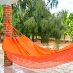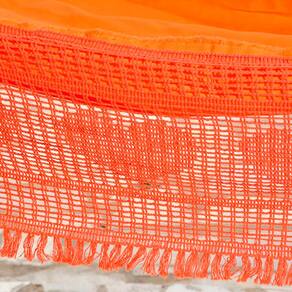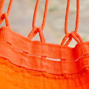 A Rede de Domir Sol a Sol Laranja, foi confeccionada em tecido de brim 100% algodão, anti-alergico, não solta tinta , o seu tecido é bastante liso e tem muita semelhança com lençol, sua gramatura é de 240 gramas por m2. altamente resistente.