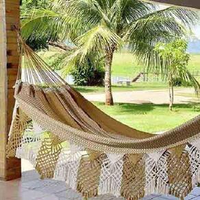 Seu babado lateral (varandas) também foi confeccionado a mão, com 7 pares de fios que se entrelaçam entre si formando um conjunto de losangos. Nossas redes de dormir valorizam e apoiam o trabalho manual e seu artesanato, criando produtos com qualidade, durabilidade, beleza e que proporciona conforto e bem estar. Essa rede de dormir pode ser utilizada em diversos ambientes, sejam eles abertos como chácaras, alpendres ou varandas, como também em ambientes fechados, é um ótimo artigo de decoração além de proporcionar descanso e conforto