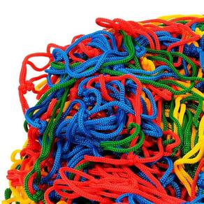 - rede de malha multicolorida, confeccionada a mão, com fio de polipropileno.