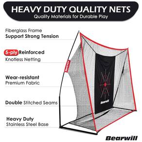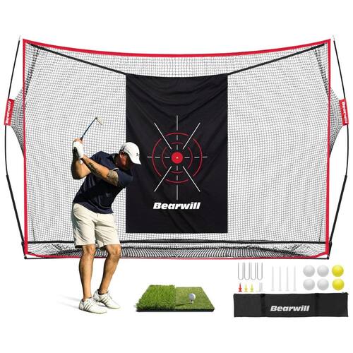 Agora você pode desfrutar da diversão do swing de golfe no conforto da sua casa com a Rede de Golfe Bearwill de 3x2m, Tapete de Golfe, Pano Alvo, 6 Bolas de Golfe de PU, 7 Tees de Golfe, 1 Tee de Borracha e Bolsa de Transporte incluídos. Esta é a melhor solução de combo de rede de golfe. A rede de golfe Bearwill ajuda você a se tornar um golfista mais confiante. Projetada por golfistas para golfistas, a rede de treino de golfe Bearwill é feita de uma rede de nylon robusta, mais espessa e resistente a rasgos, que aumenta sua durabilidade e vida útil. A rede de nylon de alta densidade suporta velocidades de bola de até 160 mph, o que faz com que nossas redes de golfe durem mais do que as redes de golfe comuns. Construção Robusta e Resistente, com estrutura de fibra de vidro de base pesada para garantir que possa suportar uso pesado ano após ano. Você pode usar esta rede de treino de golfe no quintal, em um parque, em uma garagem, no porão, interno e externo em qualquer campo, desfrute do treino e melhore suas habilidades de swing. Esta rede de golfe para treino no quintal é o melhor presente para homens. Swing com Confiança! A rede de golfe resistente de 3x2m proporciona espaço suficiente para praticar continuamente a força e a precisão de chipping, drives e swings. O tapete de golfe com grama realista tem 8 tees de golfe, fairway e rough para que você possa trabalhar em todos os aspectos do seu jogo. Montagem e desmontagem fáceis! Pule as ferramentas e as instruções demoradas com nossas redes de golfe que são rápidas e fáceis de configurar. Monte seu campo de golfe em questão de minutos! Sem necessidade de ferramentas, até as crianças podem ajudar! Inclui bolsa de transporte para portabilidade e armazenamento conveniente.