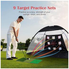 Esta rede possui 9 bolsos de alvo, projetados para oferecer prática de força e precisão em lascar, bater e dirigir o swing. Inclui 8 imagens substituíveis nos bolsos de alvo, proporcionando variedade e desafios adicionais. Dois alvos alternativos, um circular e outro com imagem de dinossauro, são especialmente atrativos para as crianças interessadas em jogar golfe.