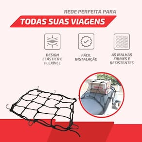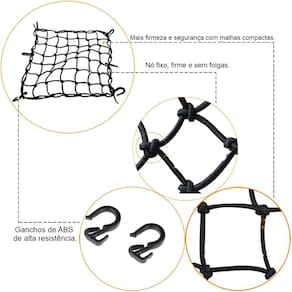 Ideal para capacetes, mochilas, bolsas, jaquetas e pequenas bagagens, a rede vem equipada com ganchos plásticos reforçados, que proporcionam fixação rápida e prática no bagageiro, baú ou suporte da moto.