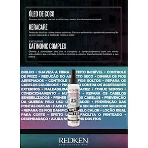 Seu poder de reparação faz de Redken One United 25 Benefits um tratamento único de brilho, maciez e reparação, que protege dos danos causados pelo uso do secador e chapinha e repara as carências da fibra capilar. Sua textura leve é rapidamente absorvida pelos fios ao mesmo tempo em que fecha as cutículas para um efeito anti-frizz eficaz e duradouro.
